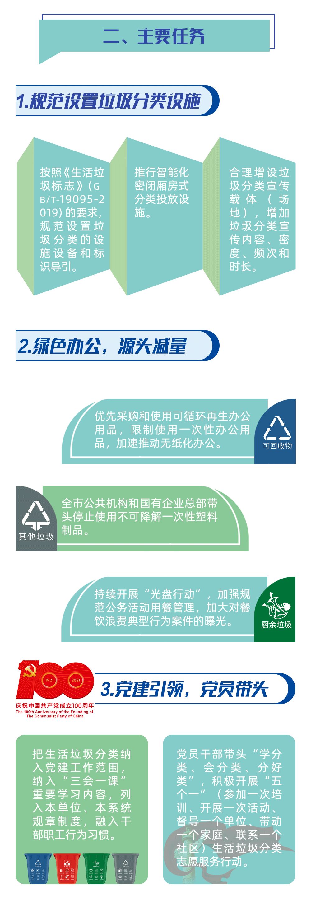 《通知》從三個方面對各公共機構開展生活垃圾分類工作進行規范和提升。一是按照《生活垃圾標志》(GB/T19095-2019)的要求,規范設置垃圾分類的設施設備和標識導引,增加垃圾分類宣傳內容、密度、頻次和時長。二是大力推行綠色辦公,持續開展“光盤行動”,實現源頭減量。三是堅持黨建引領,把生活垃圾分類納入黨建工作范圍,要求黨員干部帶頭“學分類、會分類、分好類”。
